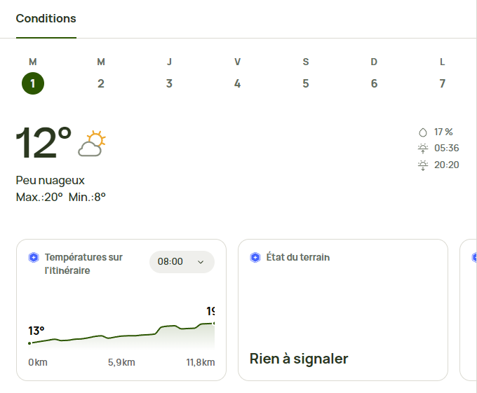 Sur la page de chaque randonnée, tu peux appuyer sur le bouton « Accès » pour ouvrir le lien du stationnement via Google Maps. Tu peux également avoir un bref aperçu de la météo et de l’état du terrain.